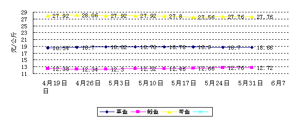 6月7日,带鱼全区平均价格27.76元/公斤,与 5月31日持平;草鱼全区平均价格18.66元/公斤,较5月31日下降0.24%;鲢鱼全区平均价格12.72元/公斤,较5月31日下降0.44%。
