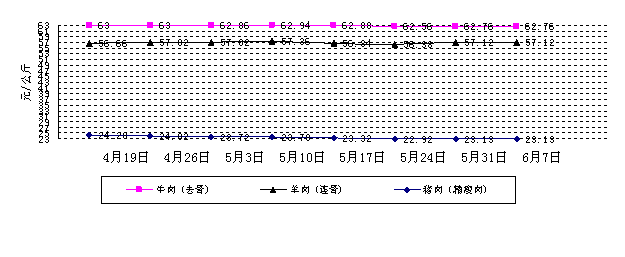 6月7日,猪肉(精瘦肉)全区平均价格23.12元/公斤;牛肉(去骨肉)全区平均价格62.76元/公斤;羊肉(连骨肉)全区平均价格57.12元/公斤,均与5月31日持平。