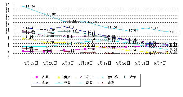 精细菜全区平均价格较5月31日下降3.64%。其中:芹菜价格6.26元/公斤,较5月31日下降4.09%;黄瓜价格4.32元/公斤,较5月31日上涨4%;西红柿价格5.24元/公斤,较5月31日下降4.1%;尖椒价格6.68元/公斤,较5月31日下降0.82%;豆角价格10.22元/公斤,较5月31日下降11.54%;茄子价格6.52元/公斤,较5月31日下降8.63%;蒜苔价格7.12元/公斤,较5月31日下降4.19%;青椒价格6.32元/公斤,较5月31日上涨2.56%;韭菜价格4.56元/公斤,较5月31日上涨3.02%。