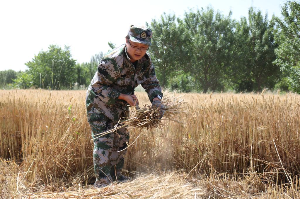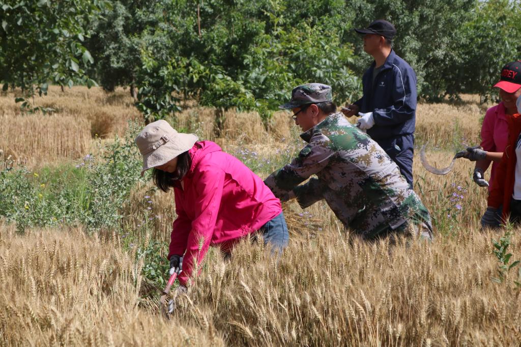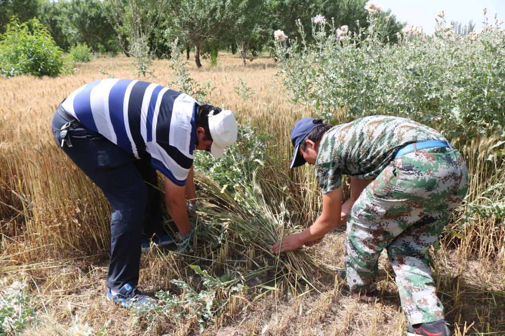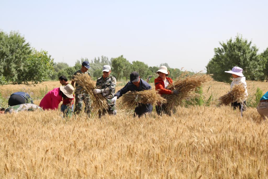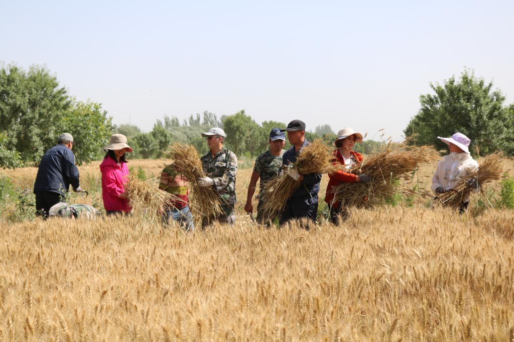 在茂密的麦子地,工作队员和结亲干部们全体都扑下身子,每人手持一把镰刀,蹲在在田里收割小麦。手扎着生疼,麦芒钻进了脖子,掉进了鞋里,汗如雨下,T恤完全湿透,但没有一个人喊苦抱怨。工作队长韩安源同志身先士卒,亲力亲为,用起镰刀来十分熟练,收割小麦的速度很快,一会儿工夫割好了一大片田。麦妮萨·依提老人感激地说:“感谢你们能够帮助我们家来收割小麦,辛苦你们了。”