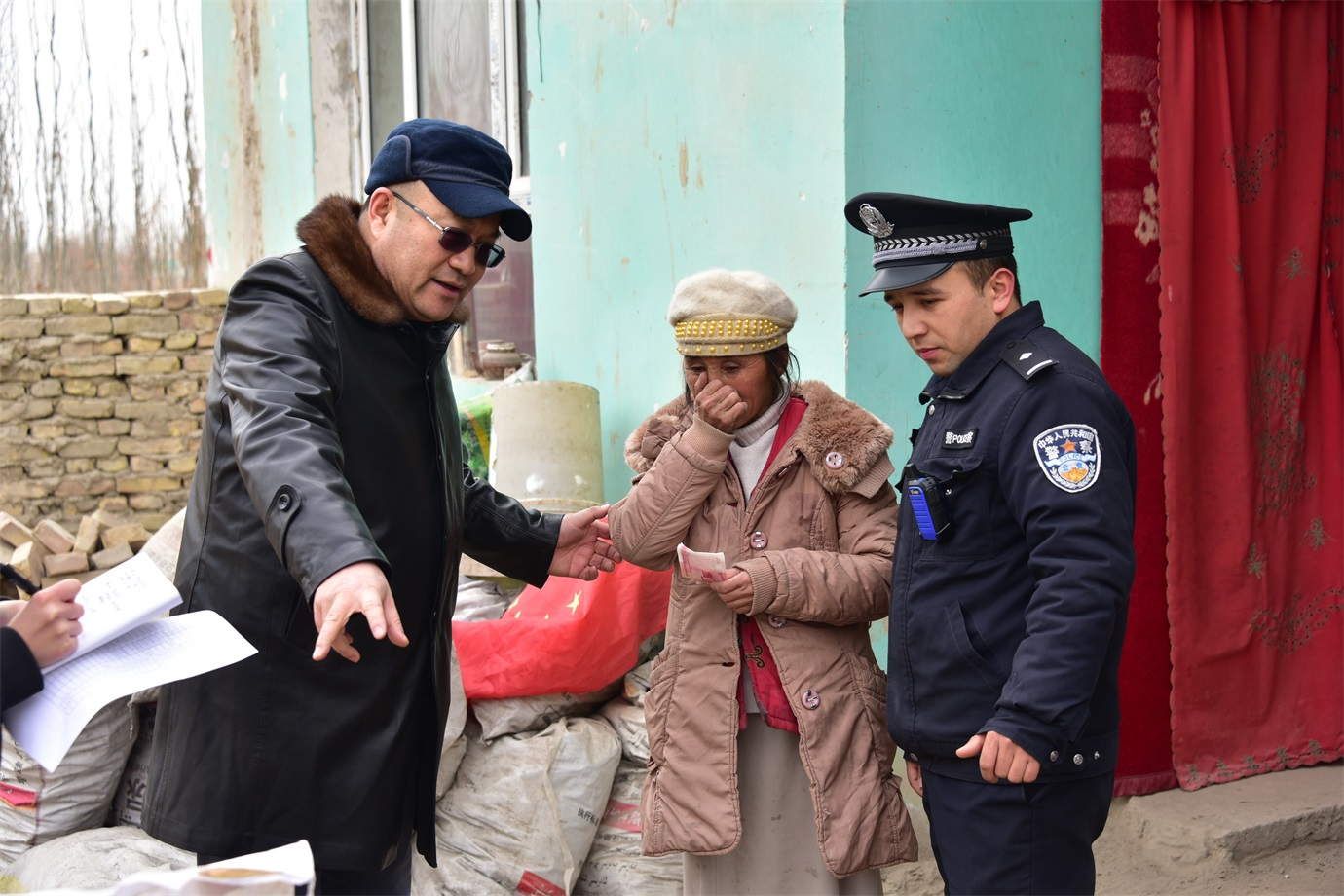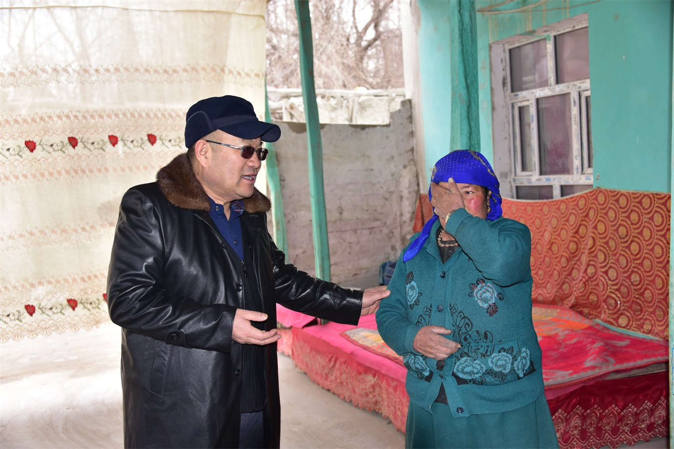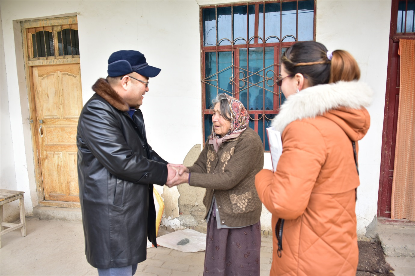 来到阿依吐拉家,在亲切地询问家中情况之后,工作队长队长赵杰元用朴实的语言表达了党和政府对他们的关心和关爱,阿依吐拉流下了两行热泪,说“我丈夫以前也是村干部,我会好好教育培养女儿,感谢党,感谢工作队这一年来对我的帮助,我知道党和国家不会忘记我们…”就这样一直握着赵杰元主任的手久久不愿分开。在这样寒冷的冬天,通过走访与慰问,带来的不仅仅是工作队和村委会的心意,更重要的是那一颗暖暖的、充满关爱的情谊,温暖了阿依吐拉一家人。