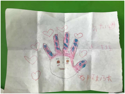有一次,我让孩子们尝试着画手掌画,先在纸上画出自己的小手掌,然后让他们想一想手掌可以衍生出什么造型,又可以怎么装饰?有画小鸡的、有画小鱼的,有画手套的……乖乖的阿米乃木画了一个粉红色的小手套,手套上画了一张可爱的娃娃脸,最暖心的是她在手套周围画了一圈爱心,还生疏地写上了“幼儿园”、“大一班”、“阿米乃木”,我看了之后感觉暖暖的,孩子们的世界真的好单纯,好美好,好有爱~