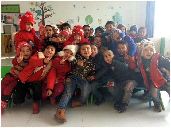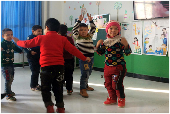 | 和其他幼儿一起学习舞蹈的阿卜杜热西提 |