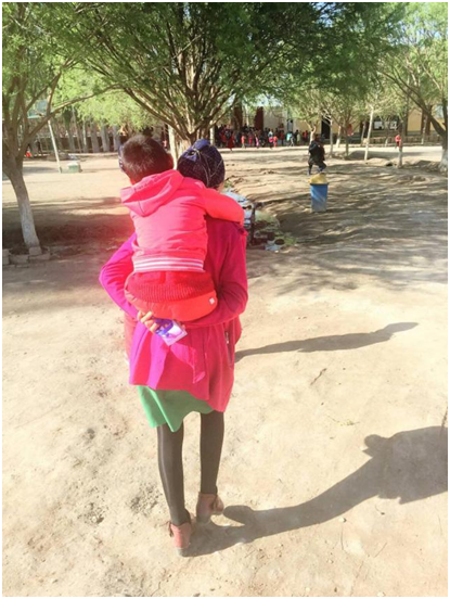 | 努尔比亚的妈妈背着她上幼儿园 |