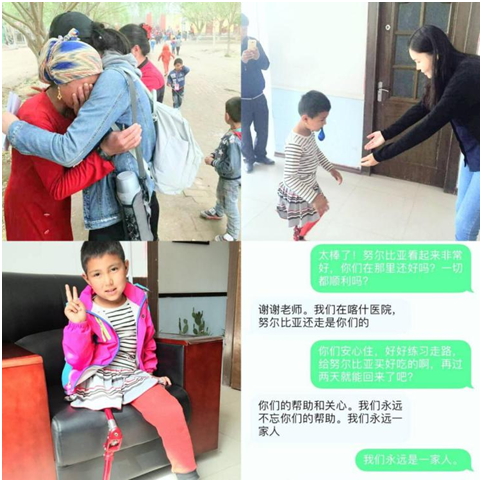 当支教老师陪同努尔比亚家人为孩子安装上假肢,孩子又回到幼儿园时努尔比亚的父母激动的说:“努尔比亚还能走,都是你们的关心和帮助,我们永远不会忘记你们对我们一家的帮助,我们是一家人。”