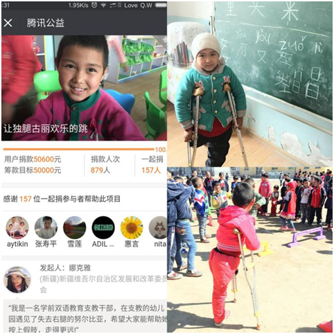 | 安装假肢前的努尔比亚及腾讯公益平台募捐信息 |